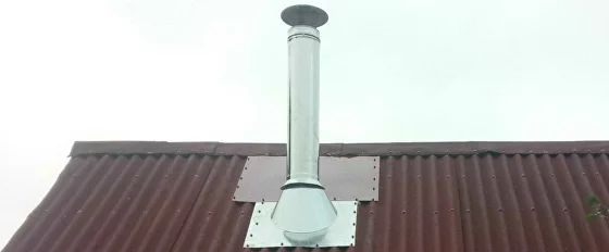 Выводят дымоход-сэндвич сквозь отверстие в патрубке крышной разделки, зазоры обрабатывают жаропрочным герметиком с рабочей температурой до 1000°С.