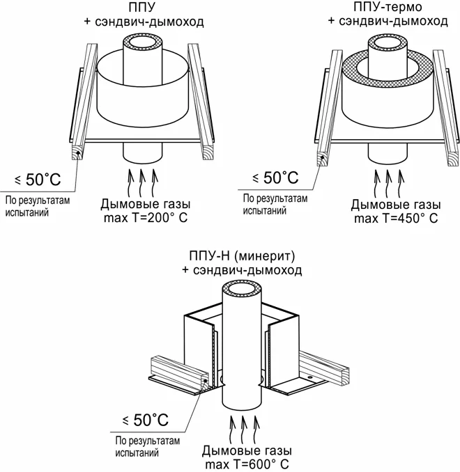 Допускается проходить через ППУ одностенным дымоходом с условием соблюдения требований ГОСТ. В случае, если дымовой канал, проходящий вблизи строительных конструкций из горючих материалов, нагревает их выше 50°С, то ППУ может использоваться только как декоративный элемент, либо должны быть проведены дополнительные мероприятия по изоляции конструкций или увеличению отступов от них (согласно действующим государственным нормам, в частности СП 7.13130).